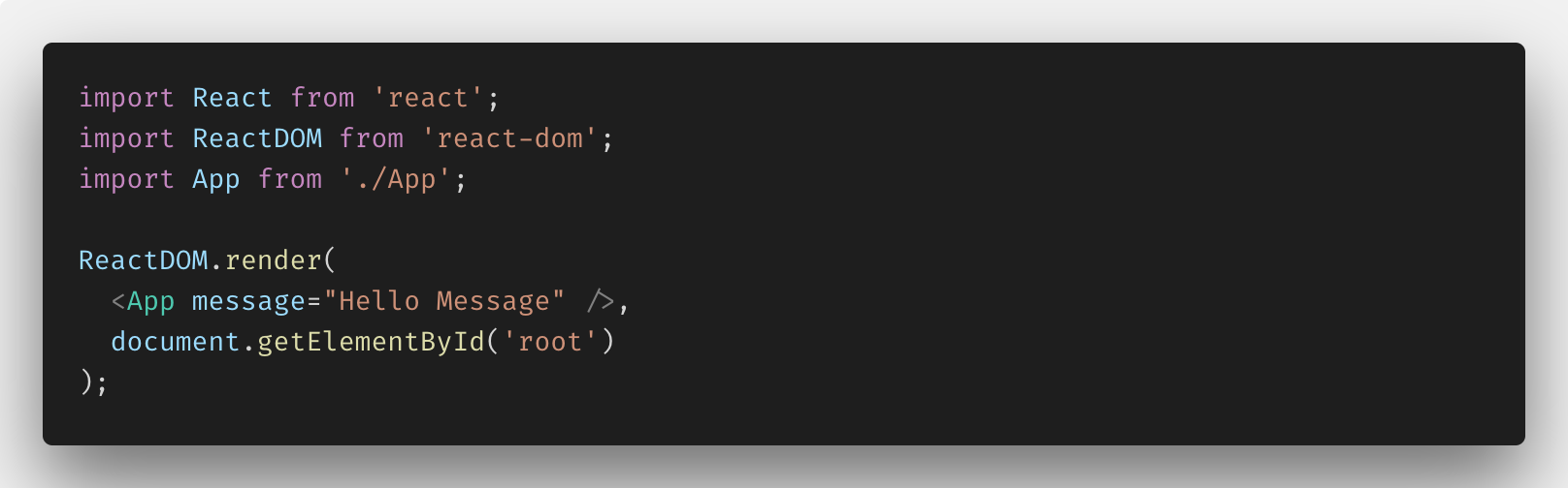 index.js 코드를 보면 message라는 변수를 App.js가 Props로 사용할 수 있게 전달해 주고 있습니다. 상속을 시켜준 것이죠. 이렇게 받은 message 라는 문자열을 App.js에서는 이렇게 사용할 수 있습니다.