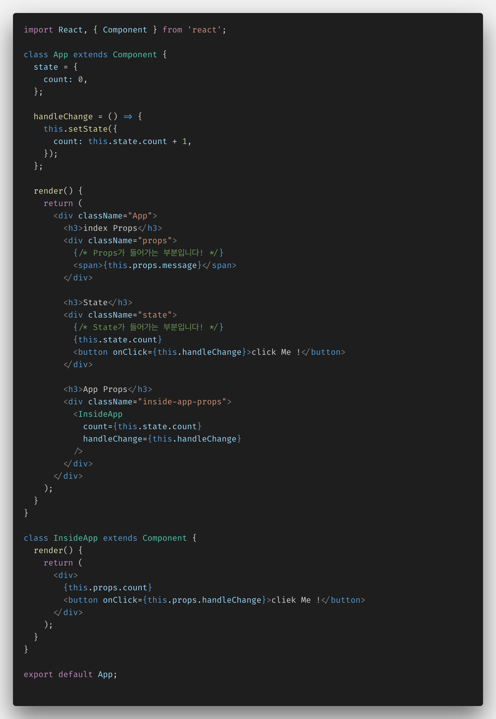 코드를 보겠습니다. 우리는 InsideApp컴포넌트에 App컴포넌트의 state인 count와 App컴포넌트의 메소드인 handleChange를 상속시켜 주었습니다. 그렇기 때문에, 두 개의 버튼 중 어떤 버튼을 클릭하던지 App컴포넌트의 state인 count가 증가하게 되어 상속받는 props인 count가 +1 되는 것 입니다.