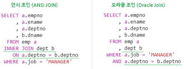 오라클 9i 버전부터 ANSI JOIN을 지원하기 시작했다. 그렇지만 아직까지 오라클 데이터베이스를 사용하는 많은 시스템에서 ANSI JOIN을 사용하지 않고 오라클 방식의 조인을 사용하여 쿼리문을 작성
