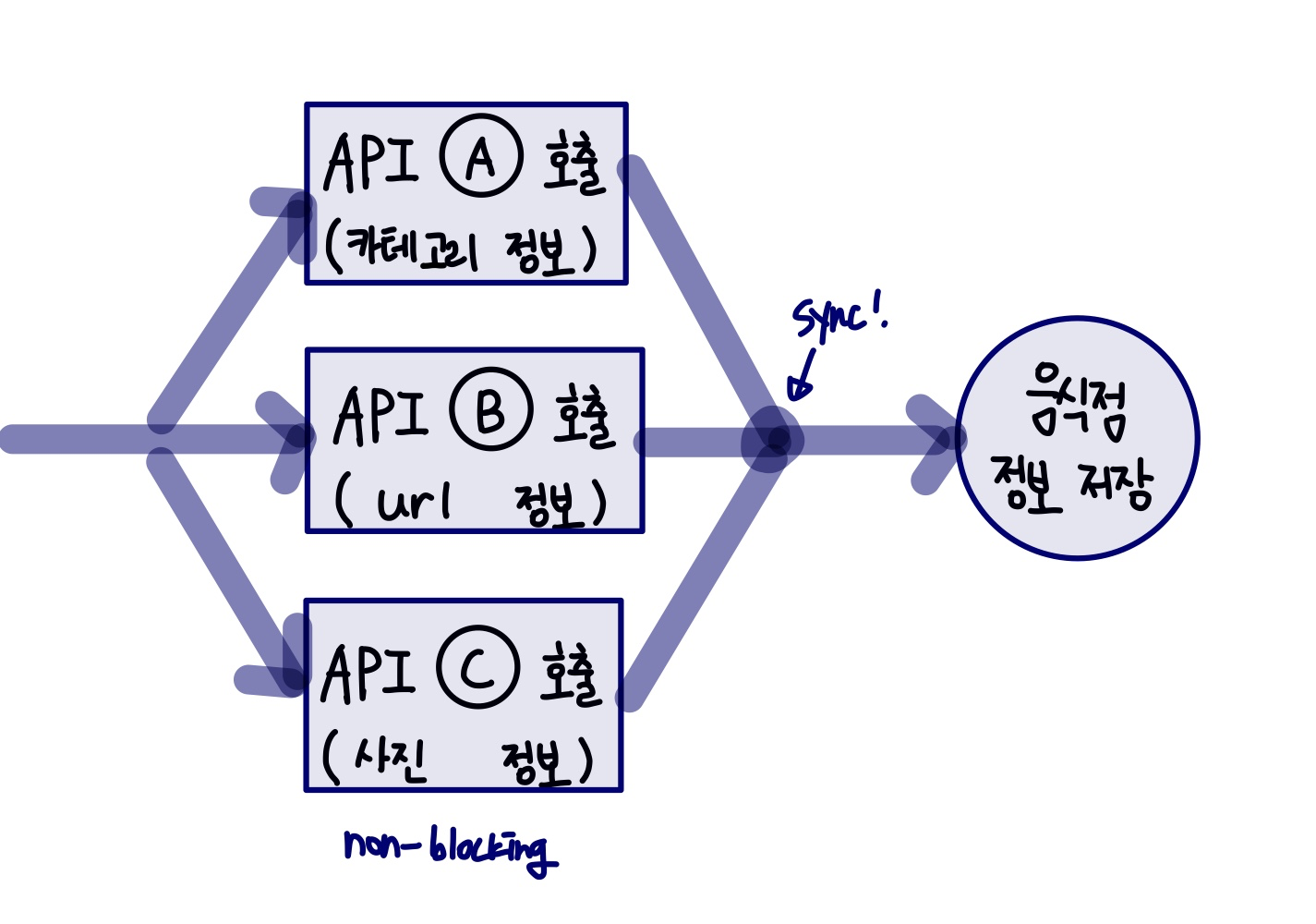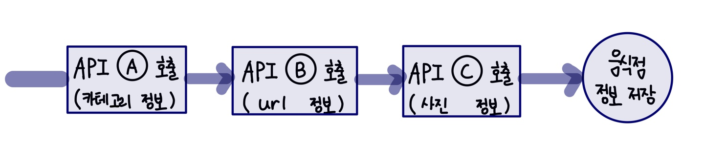 하나의 음식점의 세부정보를 위한 API 호출 1. 외부 API 호출을 통해 음식점 리스트를 가져온다.(동기) 2. 상위 5개의 데이터에 대해 세부정보(카테고리, 음식점 사진, 음식점 url)가 없는 경우 해당 정보를 추가한다. 1) 카테고리 정보가 없는 경우,비동기적으로외부 API를 호출하여 카테고리 정보를 추가한다. 2) 음식점 사진 정보가 없는 경우,비동기적으로 외부 API를 호출하여 음식점 사진 정보를 추가한다. 3) 음식점 url 정보가 없는 경우,비동기적으로 외부 API를 호출하여 음식점 url 정보를 추가한다. 3. 클라이언트에게 음식점 리스트를 반환한다.