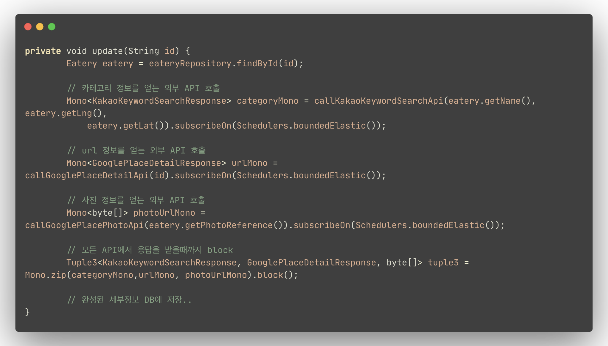 즉, zip을 통해 최종적인 결과는 동기적으로 처리되지만, 외부 API를 호출하는 각각의 Mono는 스케줄러에 의해 비동기적으로 수행된다.