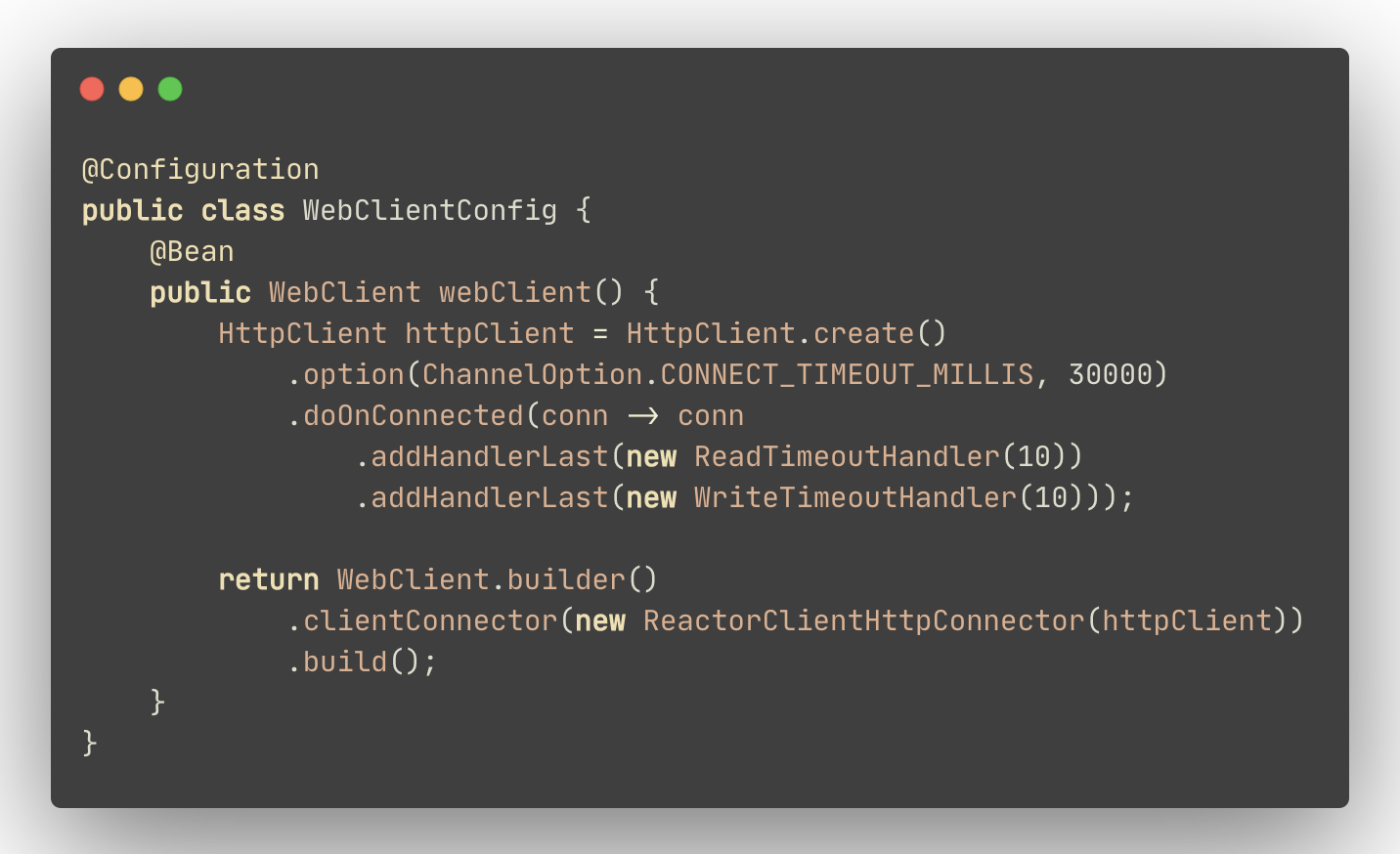 create()를 통해 connection, read, write timeout을 미리 설정하여 HttpClient를 구성하고 WebClient를 생성하였다.