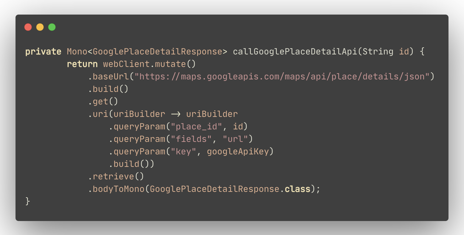 다음은 WebClient를 사용하여 구글 Place Api에 음식점 세부정보를 GET 방식으로 요청하는 코드이다.